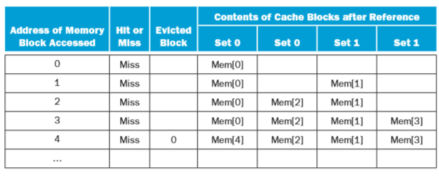 | 5.12.1 In this exercise, we will examine how replacement policies impact miss rate. Assume a 2way set associative cache with 4 blocks. You may find it helpful to draw a table like those found on page 482 to solve the problems in this exercise, as demonstrated below on the address sequence “0, 1, 2, 3, 4.” The following table shows address sequences. Address Sequence a. 0, 2, 4, 8, 10, 12, 14, 16, 0 b. 1, 3, 5, 1, 3, 1, 3, 5, 3 Assuming an LRU replacement policy, how many hits does this address sequence exhibit? | |
