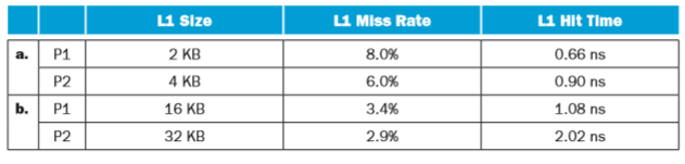 | 5.7.1 In this exercise, we will look at the different ways capacity affects overall performance. In general, cache access time is proportional to capacity. Assume that main memory accesses take 70 ns and that memory accesses are 36% of all instructions. The following table shows data for L1 caches attached to each of two processors, P1 and P2. Assuming that the L1 hit time determines the cycle times for P1 and P2, what are their respective clock rates? | |