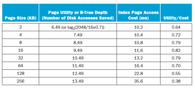 | 5.9.1 For a highperformance system such as a Btree index for a database, the page size is determined mainly by the data size and disk performance. Assume that on average a Btree index page is 70% full with fixsized entries. The utility of a page is its Btree depth, calculated as log2(entries). The following table shows that for 16byte entries, and a 10yearold disk with a 10 ms latency and 10 MB/s transfer rate, the optimal page size is 16K. What is the best page size if entries now become 128 bytes? | |