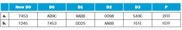 | 6.15.1 RAID 3, RAID 4, and RAID 5 all use parity system to protect blocks of data. Specifically, a parity block is associated with a collection of data blocks. Each row in the following table shows the values of the data and parity blocks, as described in Figure 6.13. Calculate the new RAID 3 parity value P’ for data in lines a and b in the table. | |