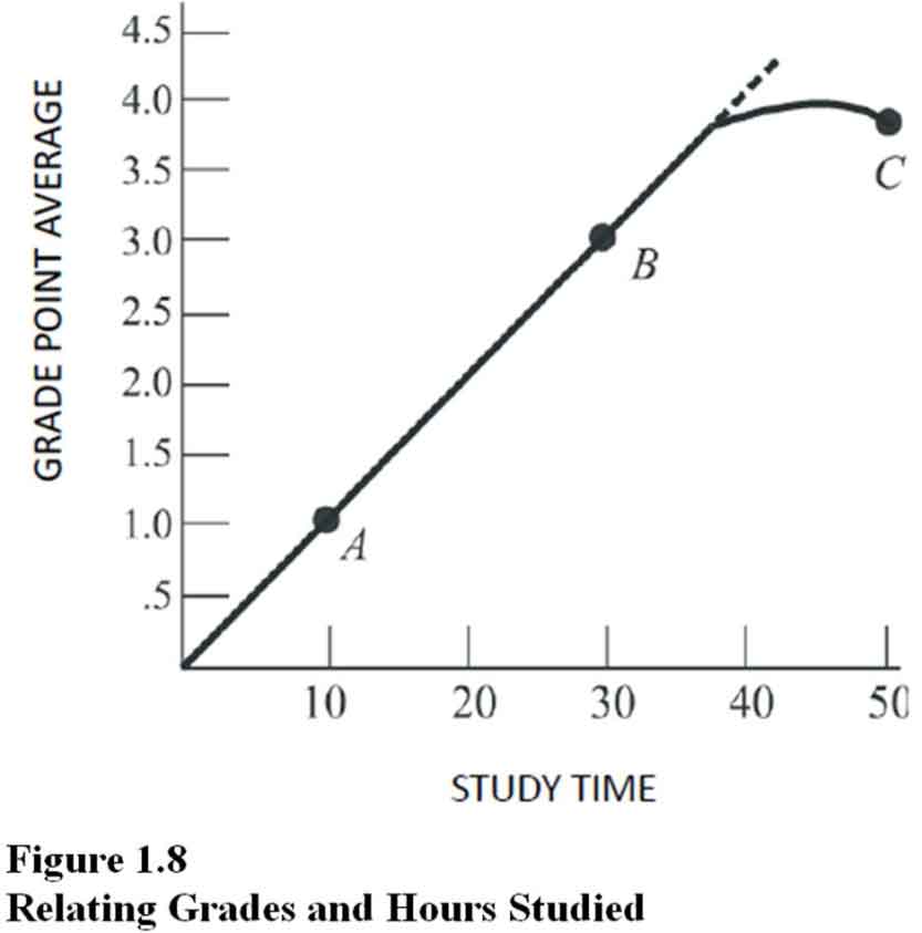 118. Refer to Figure 1.8. If the university decides to lower grading standards, then ![]() A. This curve will shift rightward. B. This curve will pivot up and to the left. C. The curve will begin to bend downward at an earlier point. D. We will slide up the curve from point B to point C. | |