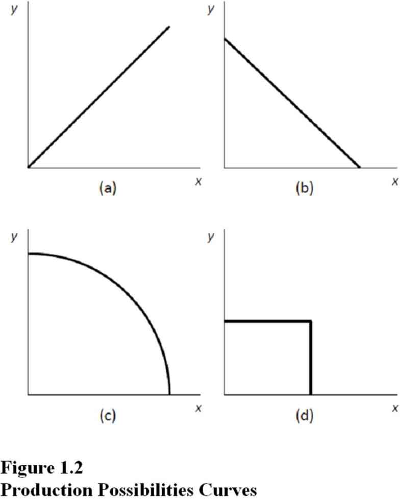 64. Choose the letter of the curve in Figure 1.2 that best represents a production possibilities curve for two goods that obey the law of increasing opportunity costs: