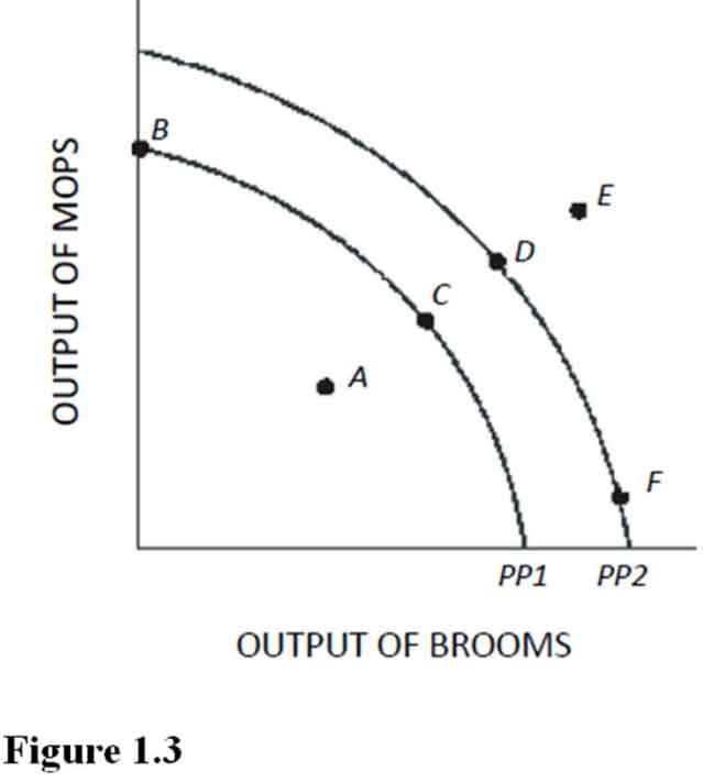 71. In Figure 1.3, a shift of the production possibilities curve from PP1 to PP2 could be caused by ![]() A. A decrease in the quantity of raw materials available. B. A decline in the production skills of workers. C. The use of improved production technology. D. All of the choices are correct. | |