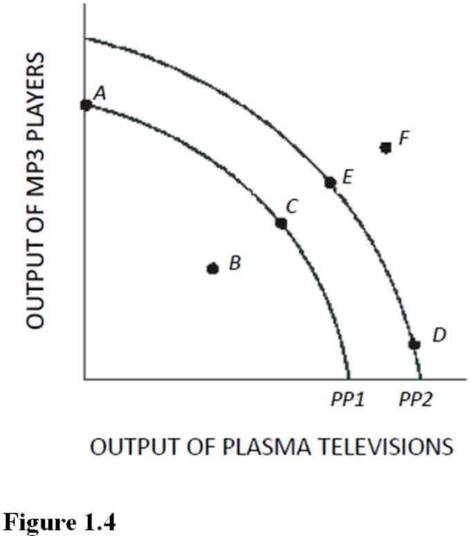 74. A movement from point C to point A in Figure 1.4 results in ![]() A. More efficient production. B. Permanent unemployment of workers producing plasma televisions. C. A reallocation of resources from MP3 player production to plasma television production. D. A reallocation of resources from plasma television production to MP3 player production. | |