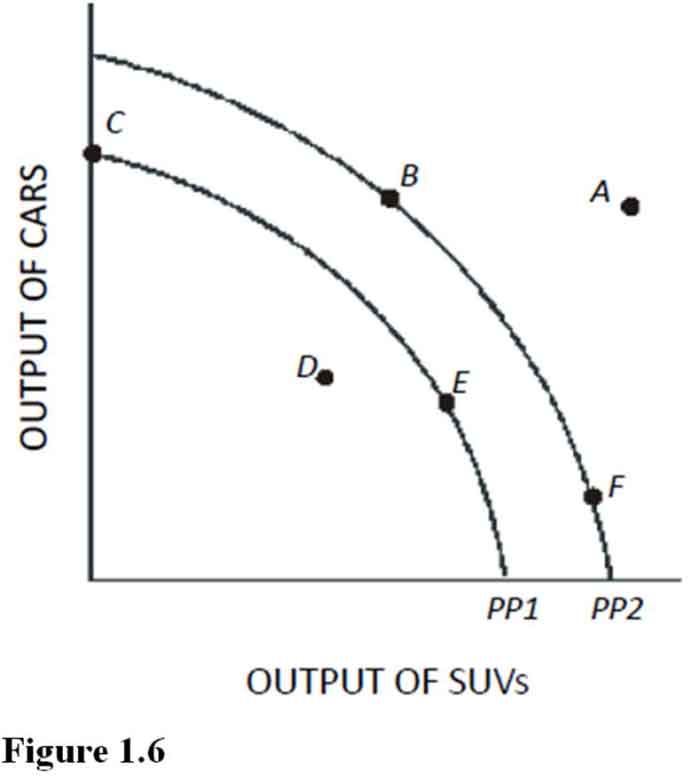 79. Using Figure 1.6, if an economy has the capacity to produce represented by PP1, then point E represents