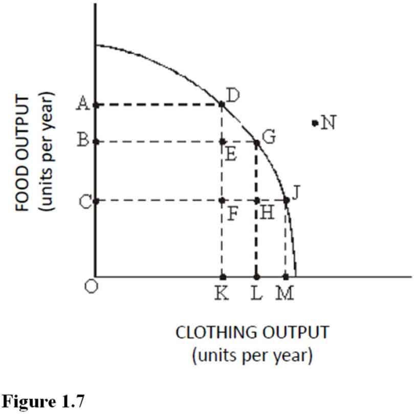 87. Refer to Figure 1.7. If this economy is currently producing at point F, then by employing more resources this economy ![]() A. Can move to point D, but not points G or J. B. Can move to points D, G, or J. C. Can move to point G, but not points D or J. D. Will remain at point F. | |